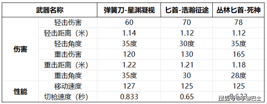弹簧刀-星渊凝视和匕首-浩瀚征途相比,轻击伤害不足,距离、角度和移速都有提升;和丛林匕首-死神相比,距离和移速有一定优势,但伤害和切枪速度稍有逊色,这样同样将相关数据也给大家整理了出来,可以看看。