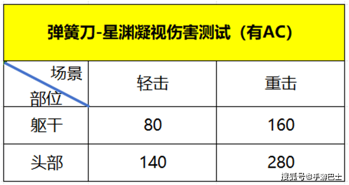 对弹簧刀-星渊凝视也进行了伤害测试,躯干上的伤害基本稳定达到80,且出刀迅速,表现非常可观,重击和看破属性下都能做到“一刀毙命”。