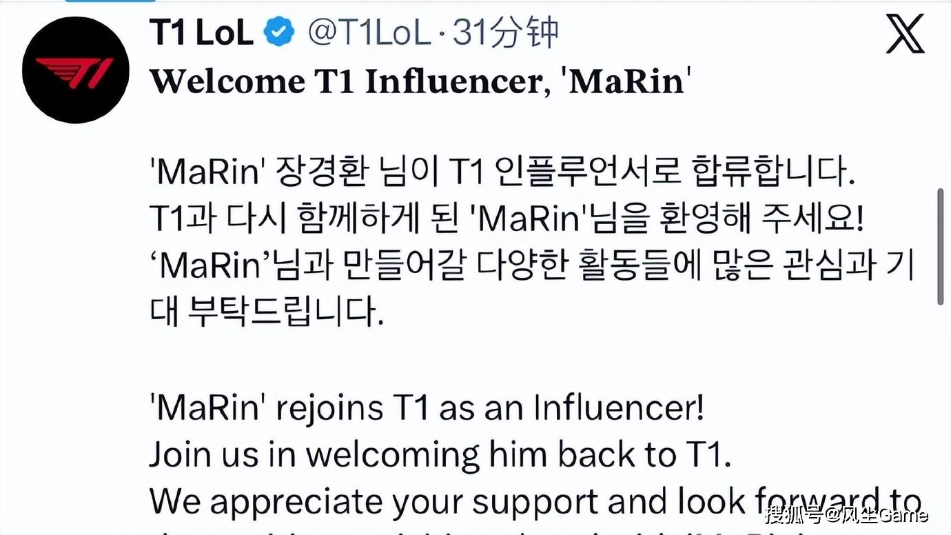 LCK赛区第二赛段常规赛,马上就要开赛了,T1作为揭幕战参赛队伍,首场比赛要交手KT,这场通信社大战,不用看都知道结局,KT作为最稳定的充电宝,能打满三局,就已经算是成功了,比赛开打的前一天,T1战队还宣布了一个新消息:S5世界冠军上单Marin,以创作者身份重返T1。