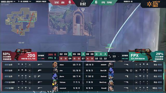 上半场开局stew在手枪局就是一个快速的四杀帮助JDG拿下了手枪分,但是antieco局被kovaQ在B的一波蜂刺三杀扭转了局势,来到长枪分的两个队伍也是打的有来有回,第六回合结束后JDG交出了暂停,暂停回来后开始追分,第十回合coconut和stew两个人在B点门口的一波双人五杀打了FPX的一个措手不及,最后两个回合也是在对枪环节都打赢了FPX,上半场最后比分来到双方6-6平。