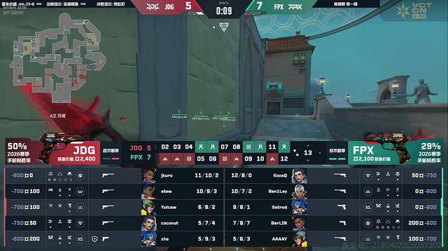 第十回合FPX调整自己的进攻方式追回一分,第十一回合JDG极限拆除爆能器,十二回合Yuicaw一波三杀,最后上半场结束JDG9-3领先FPX。