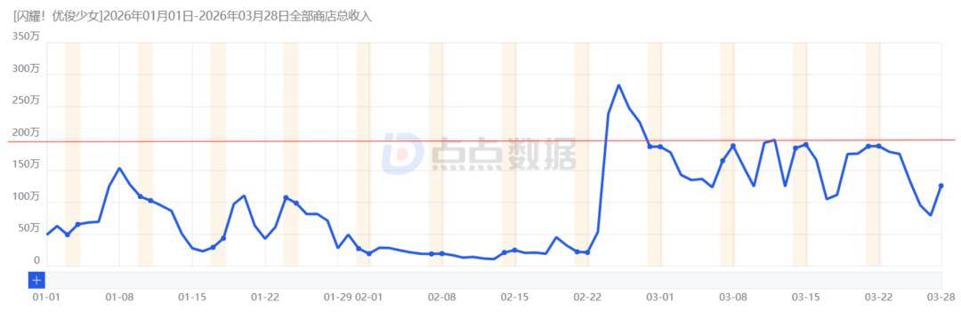 Cygames《赛马娘》于2月底开启五周年庆活动。游戏2月总收入约1.2亿元,3月总收入约3.9亿元,收入环比增长218%。从图表可见,自2月底至3月,游戏营收实现大幅攀升。整个3月,游戏单日流水稳定维持在690万—1381万的高位区间,多次逼近1381万峰值;即便在3月下旬的营收低点,单日流水也显著高于周年庆前水平。