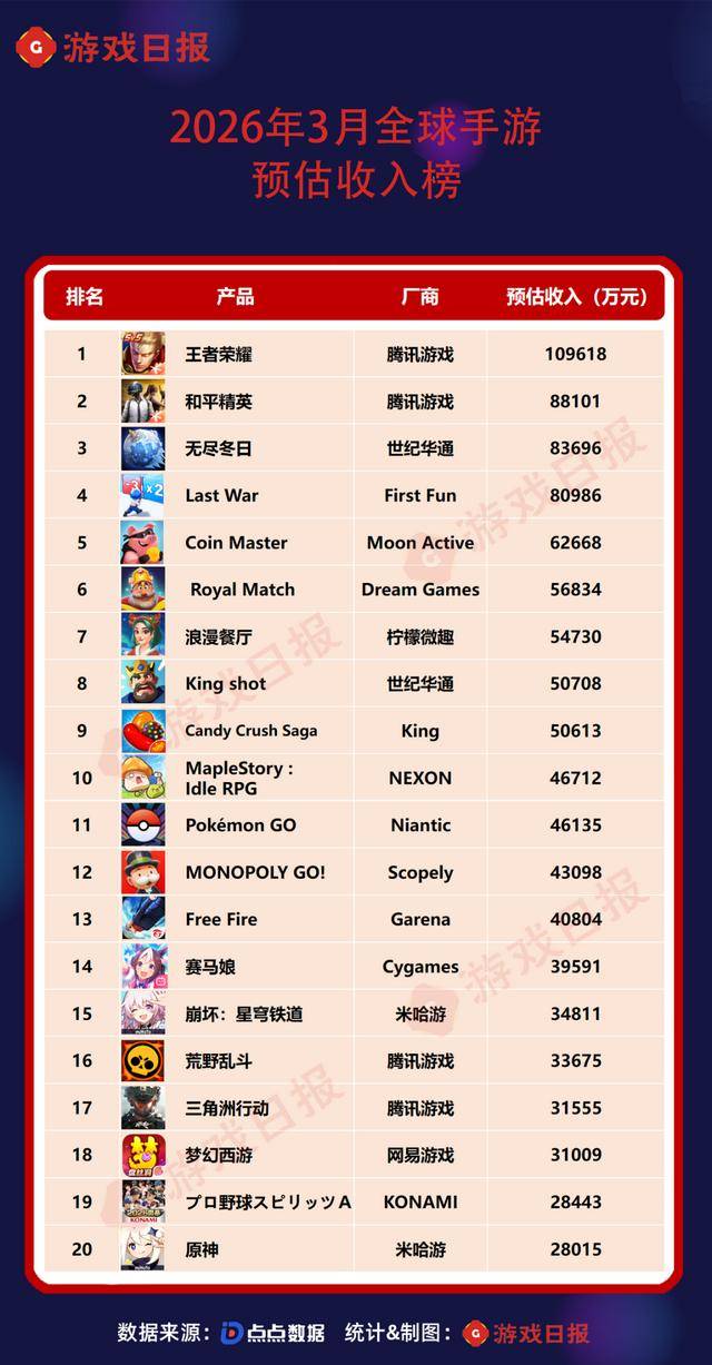 基于点点数据预估,我们统计了2026年3月份全球移动端游戏收入TOP50榜单(iOS+Google Play)。从上榜厂商分布来看,TOP50中腾讯以9款产品领跑,米哈游有3款产品入围;Playrix、世纪华通、Dream Games、KONAMI四家厂商,各有2款产品登榜。