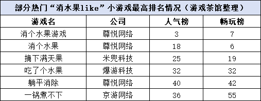 而这两款《消个水果》的走红,也让更多团队注意到了这一玩法的潜力。一时间,市面上接连涌现出大批同类产品,不少厂商纷纷跟进效仿,其中多款游戏也凭借相似玩法成功登上榜单,收获了不俗流量与热度。