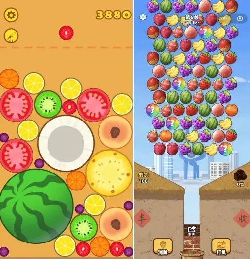 具体来看,这两款游戏玩法简单、上手门槛极低:每一关的界面中都会悬浮着各式各样的水果,玩家只需点击任意水果,水果便会自动下落至下方收集槽。当槽内相邻位置出现两个相同种类的水果时,便会自动消除。玩家只要将界面中所有水果全部消除干净,即可成功通关。