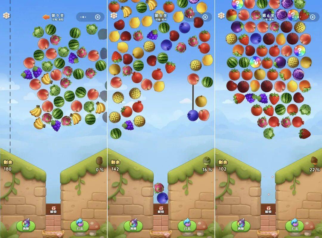 除此之外,部分关卡还加入了神秘箱、绳索绑定、多层堆叠等设计。神秘箱会隐藏水果种类,只有点击落下后才能知晓品种;绳索会将两颗水果牢牢绑定,必须同时下落进入卡槽;而多层堆叠模式下,同一位置会叠放多个果实,只有先消除上层,才能看清下方的水果类型。