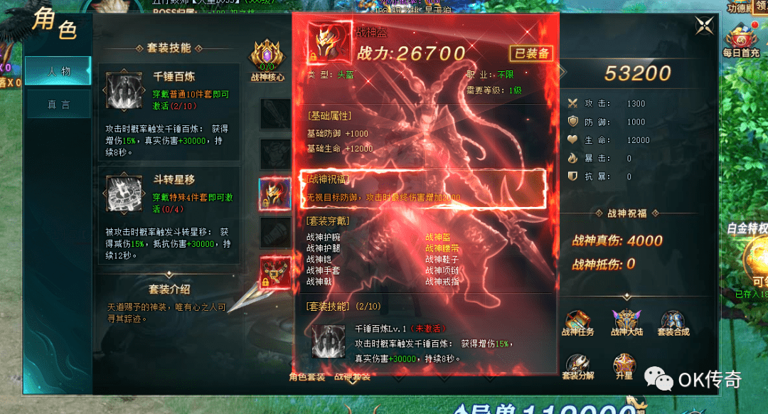 战神装备除了正常增加基础属性外还有战神祝福效果:无视目标防御,攻击时最终伤害增加2000,集齐十件战神装备激活套装效果,千锤百炼:攻击时有几率触发,获得增伤15%,真实伤害+30000,持续8秒。