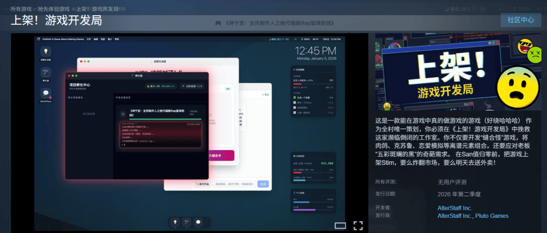 我们还做过《上架!游戏开发局》。玩法有点像 TapTap Maker,但我们是把“AI 帮你做游戏”这件事做进了游戏机制本身。你在游戏里扮演一个被老板PUA的游戏策划,要赶 deadline,要做项目,还要把游戏拿去说服投资人、上架平台。这样一来,就算AI生成的游戏本身比较粗糙,也不再是问题。因为“粗糙”本身就可以变成笑点,反而成立了。