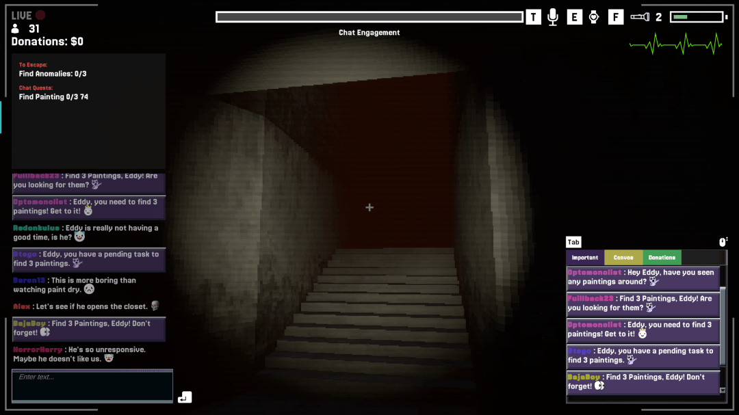 比如我们还有一个恐怖游戏方向《Streamphobia》,玩家设定成主播,需要和直播间观众互动,看弹幕,观众会根据你做的事产生反应,甚至给你派任务。如果你不听他们的,他们还会影响 3D 空间里发生的事,甚至派怪来吓你。我们想看的就是,AI怎么去动态改变游戏内容,而不是它只是一个聊天框,拿掉以后对游戏没任何影响。那种就不是我们想做的。