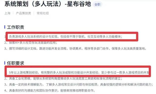 首先是对多人玩法品类的设计进行扩充,这是最直接的途径。在多人玩法系统策划的岗位需求中,米哈游明确提到需要“5年以上游戏策划经验,有完整的多人玩法或联机功能设计开发经验,至少参与过一款多人游戏项目的开发”,工作内容主要负责游戏多人玩法系统的设计与实现,包括但不限于联机、社交互动等多人功能模块。