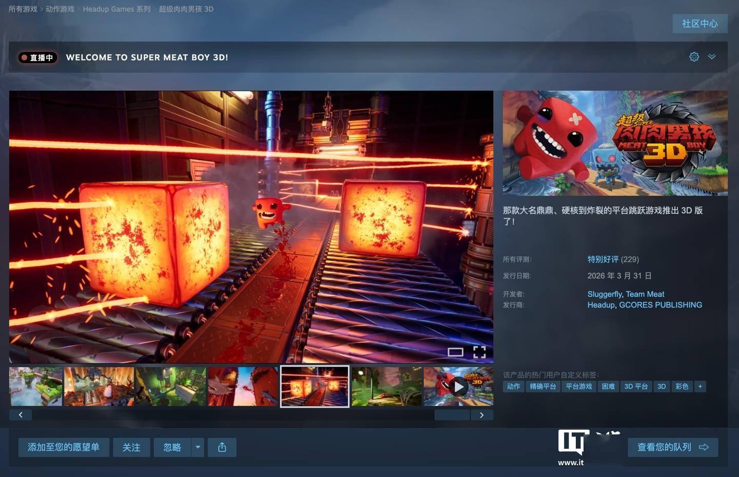 IT之家 4 月 2 日消息,开发商 Team Meat 旗下新作《超级肉肉男孩 3D(超级食肉男孩 3D,Super Meat Boy 3D)》已在 Steam 平台发售,首发 9 折后到手价 79.2 元,截至IT之家发稿游戏好评率 86%“特别好评”,IT之家附游戏商品页(https://store.steampowered.com/app/3288210/_3D/?l=schinese)。