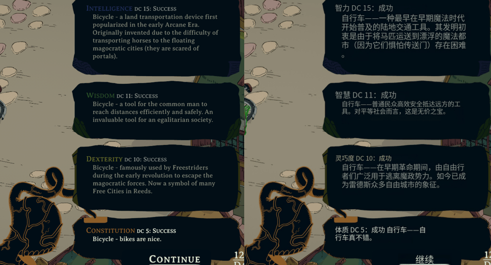 在实际的体验中,《奥秘消退》在叙事取向上确实与《极乐迪斯科》高度相似,但它并非一味在模仿自己的引导者。即便脱离这层标签,它依然是一个“能独立行走”的作品。除了较高质量的文本之外,游戏在玩法上也加入了技能成长与装备搭配等系统。从底层逻辑来看,《奥秘》反而更接近最开始的CRPG母本——DnD(龙与地下城)。