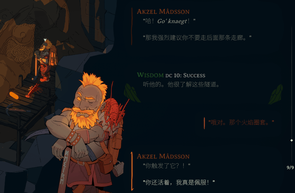 《奥秘》中也存在类似的短线设计。在探索地下城时,我曾因为路线偏差,“提前”触发了一个火球装置;而在后续与Akzel的对话中,他会提醒玩家“不要走后面的走廊”。由于我已经经历过该事件,游戏因此触发了一句额外的反馈:“你还活着,我真佩服”。