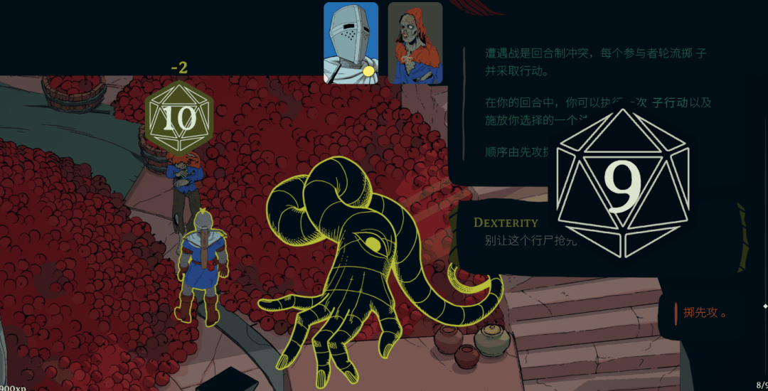 除了大量的对话与文本阅读外,作为一名失忆的牧师,玩家还需要重新收集法术,逐步构建自己的能力体系。在纯文本判定与战棋玩法之间,《奥秘》选择了一种更折中的方式:战斗以回合制的掷骰判定与法术释放为核心,策略操作空间相对有限。