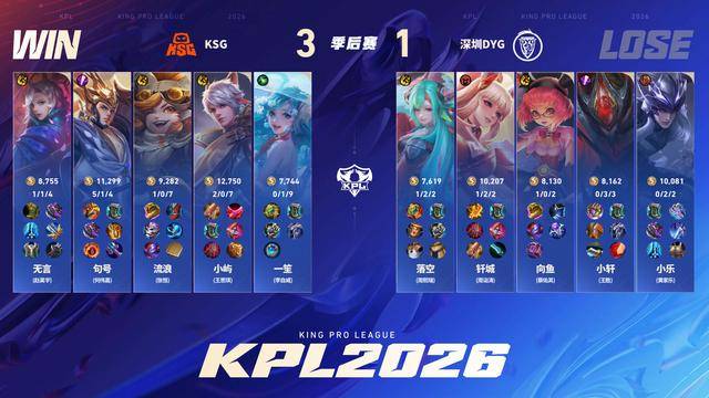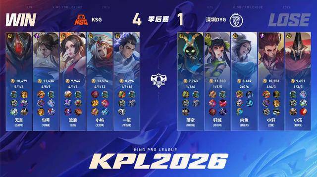 KSG4-1战胜DYG,成功挺进四强。这场比赛KSG赢的比较轻松,句号和无言这对状元上野的表现尤为出色,流浪五局比赛只死了一次,KDA高达37。而DYG这边小轩在赛后非常难受,掩面痛哭,想必是对自己的发挥不太满意。
