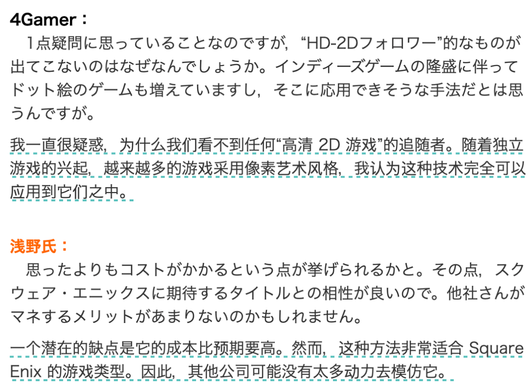 在 3D 游戏里这两个问题都不是事,可是在 HD-2D 游戏里,这就意味着会有更长的开发周期,团队需要一次次调校,直到达到目标。《八方旅人》制作人在接受采访时也说过,HD-2D 画面非常烧钱。