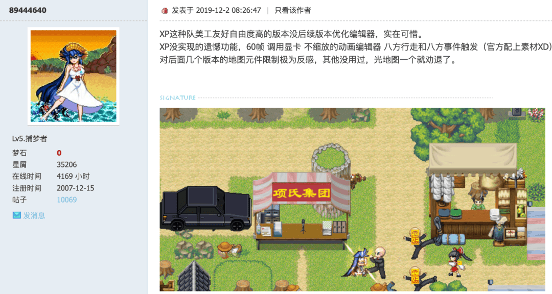 像是有人在 2019 年发帖说,2004 年的 RPG Maker XP 对美工友好自由度高,后边几个版本对地图元件限制让他很不爽,所以根本不用。