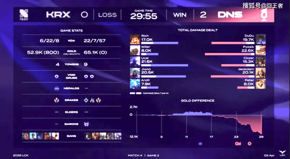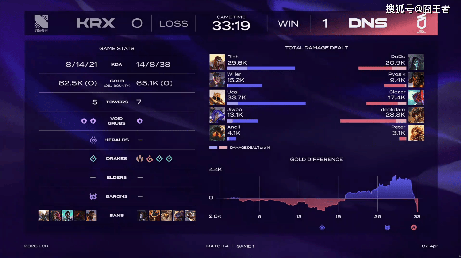 4月2日的赛程,由DK对阵NS,以及KRX对阵DNS组成。在率先结束的第一场比赛中,NS创造奇迹,速通DK。那么KRX和DNS,他们谁能获胜,就让赛程来告诉我们把。