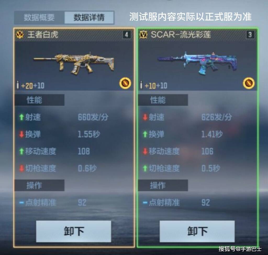 王者白虎作为SCAR系列王者级步枪,本期将把它与同类型武器SCAR-流光彩莲花进行对比。