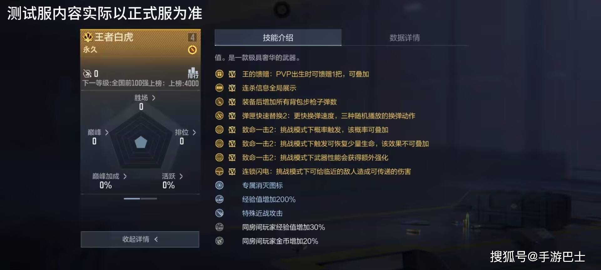 王者白虎凭借全能技能体系,成为竞技挑战通吃的全能神枪!在竞技方面,“王的馈赠“开局赠枪可叠加,拥有更快换弹速度。在挑战方面,“致命一击2”有概率触发并且能够叠加,不仅能够回复生命值,还能额外强化武器性能,其“连锁闪电”技能可对邻近敌人造成传递伤害,是真正兼顾竞技强度与挑战实力的顶级枪械。