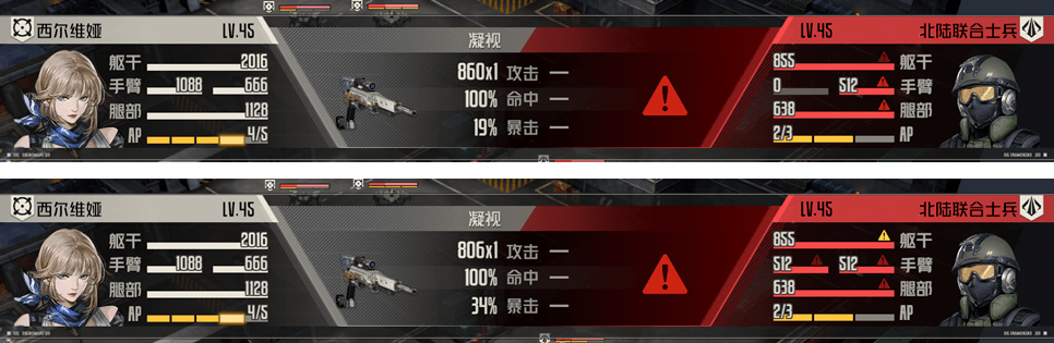综合而言我们用西尔维娅就是要利用她能稳定“瞄准”的固定打击特色,多次击破对方的部位来触发“再攻击”,同时再借由她出色的移动能力形成大范围的定点压制,例如我们可以利用瞄准来快速击破对方的躯干,又或者可以击破对方的双臂来限制输出,亦或者击破腿部来限制移动等等,所以西尔维娅的功能其实是非常丰富且多元的,但不管如何我们的基础要求必须有两个,一是要能“瞄准”,二是“伤害肯定越高越好”,所以前中期维一会更倾向于选择带【狙击】,后期再换成【盛放】,如果你玩起来实在觉得输出和AP难以平衡也可以考虑前中期带【直感】,但【虚实】这个技能由于有一定不确定性,大部分战斗不建议使用,但对于炮台这种只有1个部位的敌方却反倒成为了一种优选策略。