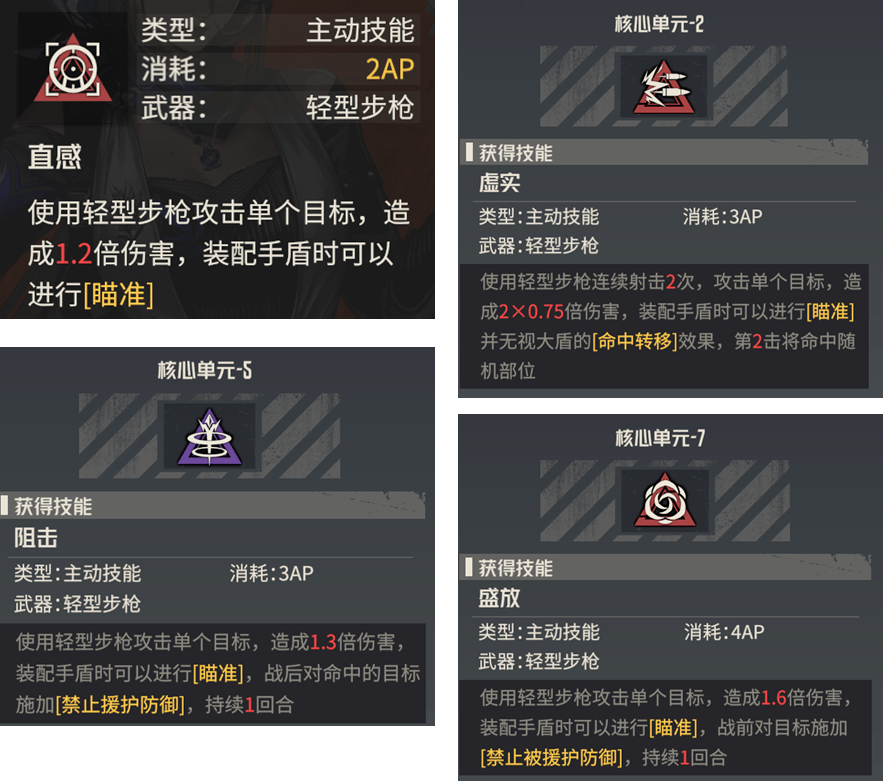 接着针对西尔维娅要选择带的主输出技能,上面4个技能基本上就是全部的考虑范围了,【直感】2AP换1.2倍伤害;【虚实】3AP换2×0.75倍伤害,但只有0.75可以瞄准并无视盾牌转移;【狙击】3AP换1.3倍伤害,可禁止对方援护友方;【盛放】4AP换1.6倍伤害,可禁止对方被友方援护。
