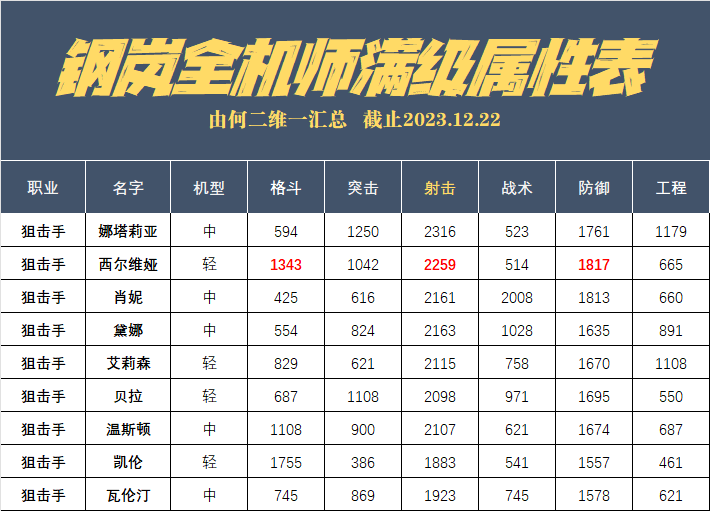 首先我们来看维一为大家整理的全狙击手的属性值,虽然属性不能代表全部,但却能从中发现官方对这位角色的定义,针对西尔维娅而言,射击属性在所有狙击手中排第2,其余则是防御排第1,格斗排第2,这与她普遍会携带“手盾”这个武器有很大关系,因为“手盾”是属于格斗武器的,同时也属防御性之的武器,所以这两项属性她才会比较显眼。