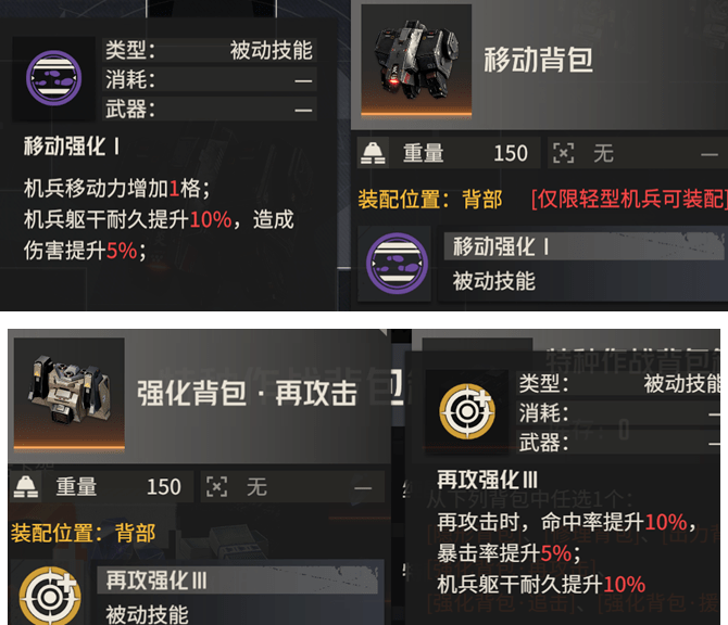 而【再攻背包】则可以为她的二次、三次再攻击提供命中率和暴击率的辅助,后续开了四次再攻击后这个效果还会更加凸显,不过论综合效果的话,维一还是在更多战斗场景中更倾向于【移动背包】。
