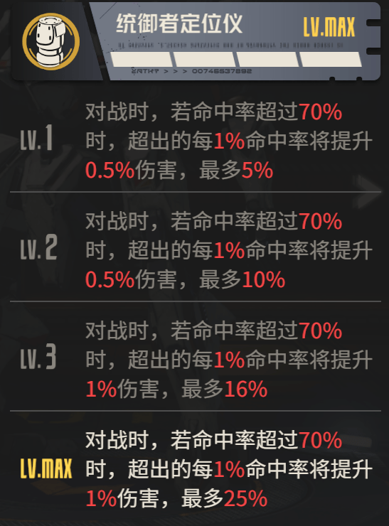 另外针对刚刚所提到的【统御者定位仪】的命中增伤,维一想说的便是大家千万不要神化一个东西或效果,几乎没有什么效果是无懈可击的,【统御者定位仪】亦是如此,命中增伤的条件是基础命中得超过70%后才能按照高出的命中来增伤,最高95%命中即可享受到上限25%的增伤,看上去很美是不是,的确在等级压制和等级类似的关卡中,这个增伤可以享受到的几率是非常高的,但是在越级挑战的关卡中,大家请看下图: