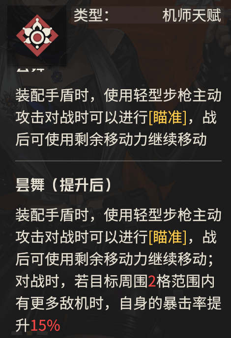 然后西尔维娅的天赋【昙舞】其实就是2个基础效果,第一点带手盾就可以【瞄准】,这也是西尔维娅最重要的能力依仗,在实战中会发挥出极大的价值;第二点则是战后可以用剩余移动力移动,配合狙击手的再攻击特点,即使你不带移动背包也可经常实现走6格再攻击的情况,其移动范围可谓极为夸张。