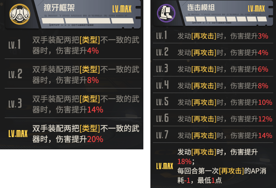 暮色之牙自带的【獠牙框架】可以完美适配西尔维娅,毕竟西尔维娅一般双手就是带轻型步枪+手盾,一个属于射击类型武器,一个属于格斗类型武器,可以很好的触发20%增伤;此外【连击模组】也是极为适配狙击手,尤其是西尔维娅这类极度依赖再动输出的角色,其不仅满级下有高达18%的再攻击增伤,还有AP消耗的减少,所以是不是暮色之牙才是......西尔维娅真正的天命机兵呢?(例如可以考虑第一下先用普攻打个血量不高的部位进行破坏,后续的再攻击再选择你想真正输出的部位来打)