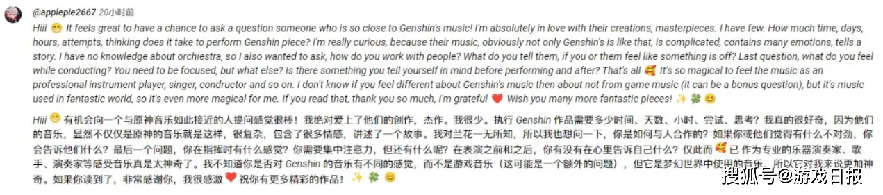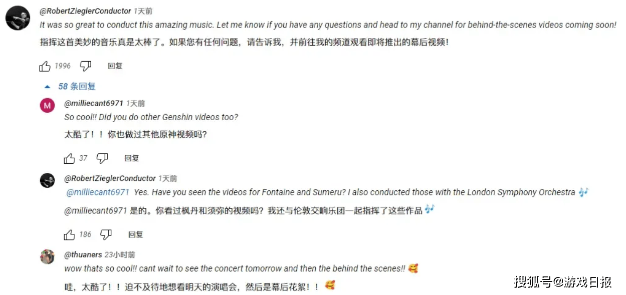 而在音乐会开始之前,指挥本次原神2023线上音乐会的大佬还出现在了油管评论区和外网原神玩家们进行了一波互动,从他的言语来看,这一次这位指挥大佬也很自豪自己能够与这么优秀的演奏者一起合作。