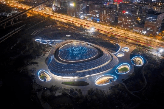 建筑造型以“星际涡旋”为设计理念,故此又被称作“星际战舰”。外形科技感与未来感十足,体现电竞赛事年轻、潮流的特点。