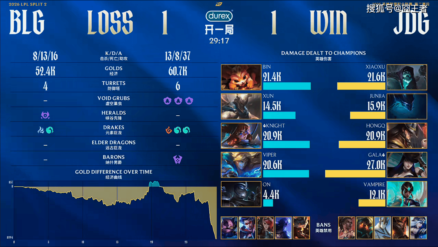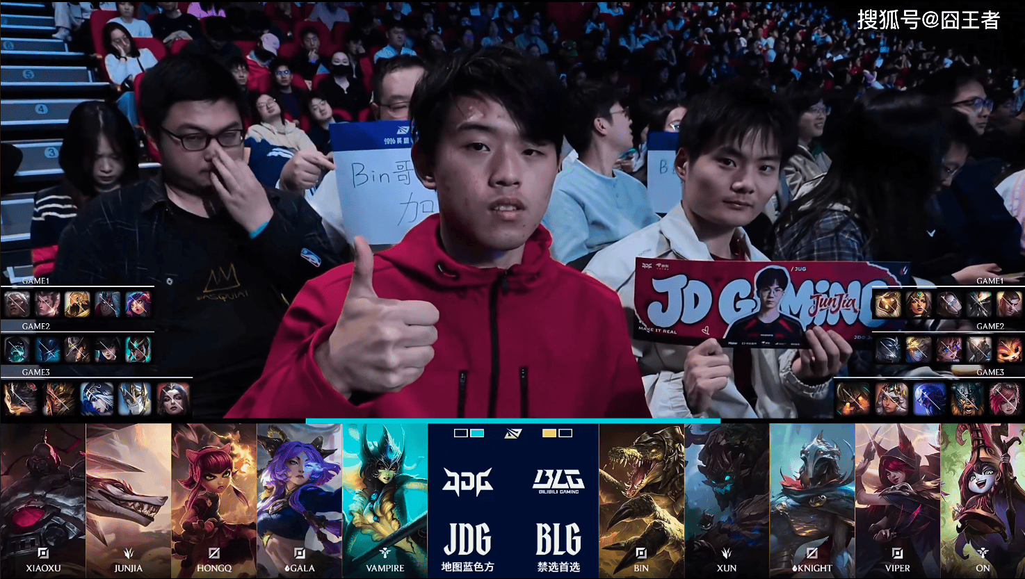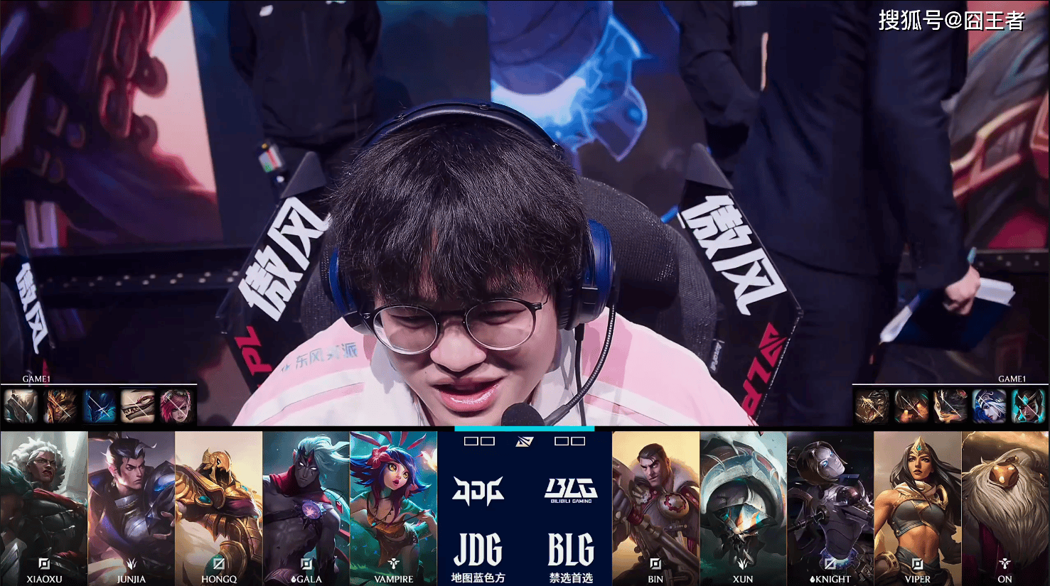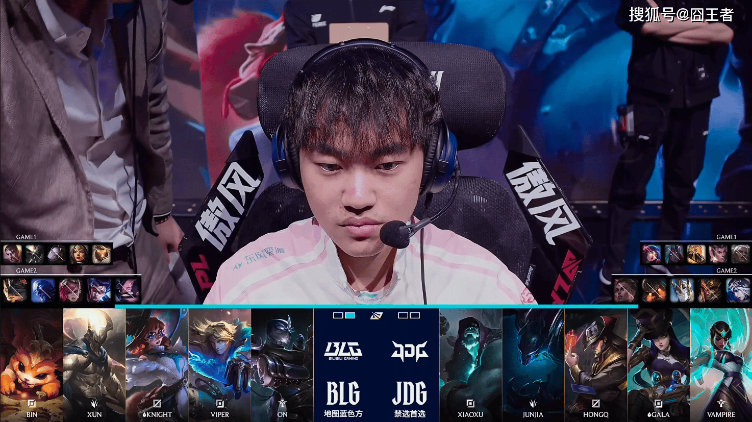 第一局比赛,JDG蓝色方,禁用:蔚、纳亚菲利、梦魇、皇子、潘森,选用:Xiaoxu安蓓萨、Junjia赵信、HongQ沙皇、GALA韦鲁斯、Vampire妮蔻;BLG红色方,禁用:鳄鱼、泰坦、兰博、艾希、卡尔玛,选用:Bin杰斯、Xun蝎子、knight发条、Viper希维尔、ON巴德