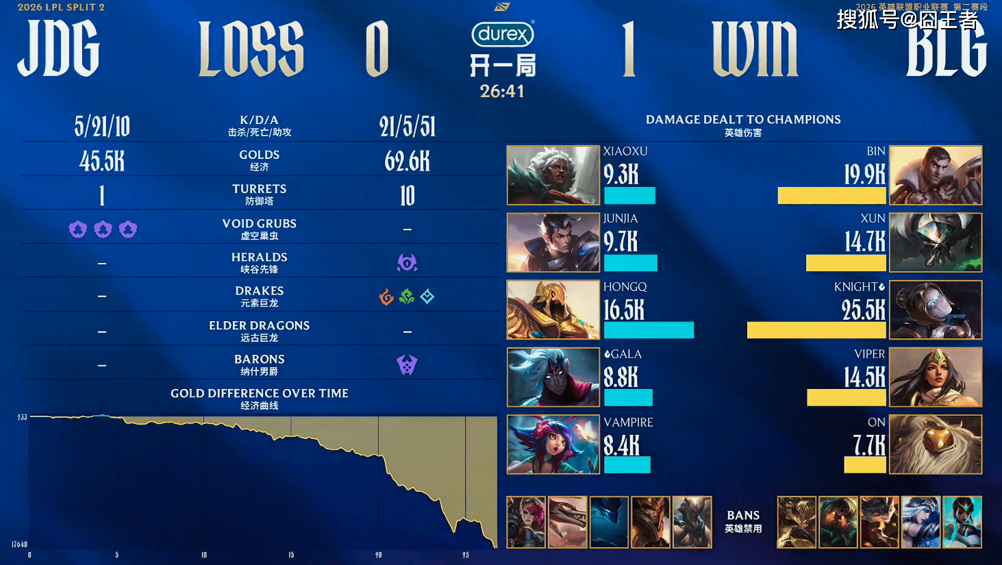 结果第一局比赛,BLG很快就进入了角色,将比赛打成了单方面的碾压局。比赛第16分钟,JDG先锋团击杀Junjia赵信,前期打出4000经济领先;比赛第20分钟,两队在下路爆发激战,BLG一波打出0换4大胜;比赛第21分钟,JDG全力抓掉Bin杰斯,BLG反击打出1换3;最终比赛第26分41秒,GALA韦鲁斯率先阵亡,knight发条三杀BLG打出1换4后一波。