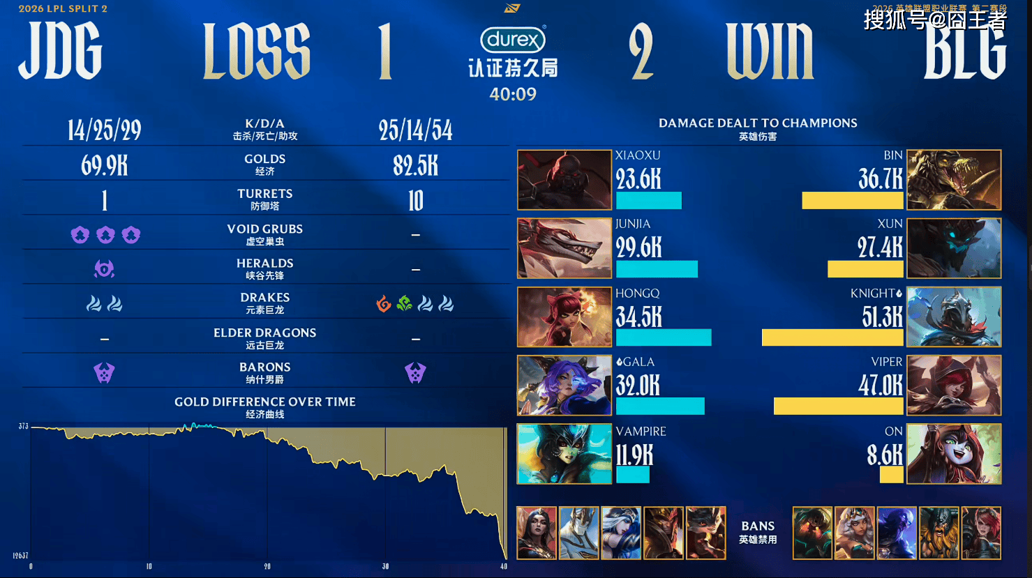 第二局比赛,BLG蓝色方,禁用:凯南、薇恩、蔚、瑞兹、兰博,选用:Bin纳尔、Xun潘森、knight阿萝拉、Viper伊泽瑞尔、ON慎;JDG红色方,禁用:梅尔、泰坦、加里奥、皇子、艾希,选用:Xiaoxu掘墓、Junjia梦魇、HongQ卡牌、GALA女警、Vampire卡尔玛