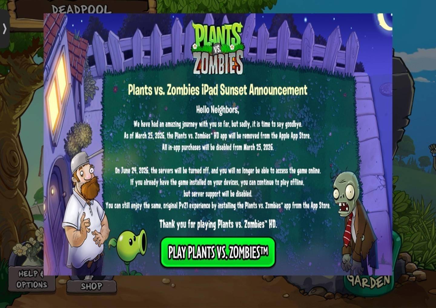 IT之家 4 月 5 日消息,继宣布关闭《战地:硬仗》部分版本服务器后,EA 再次“痛下杀手”。经典塔防游戏《植物大战僵尸 HD》(iOS 版)也将停止服务从商店下架,并会在今年 6 月 24 日关闭在线服务。