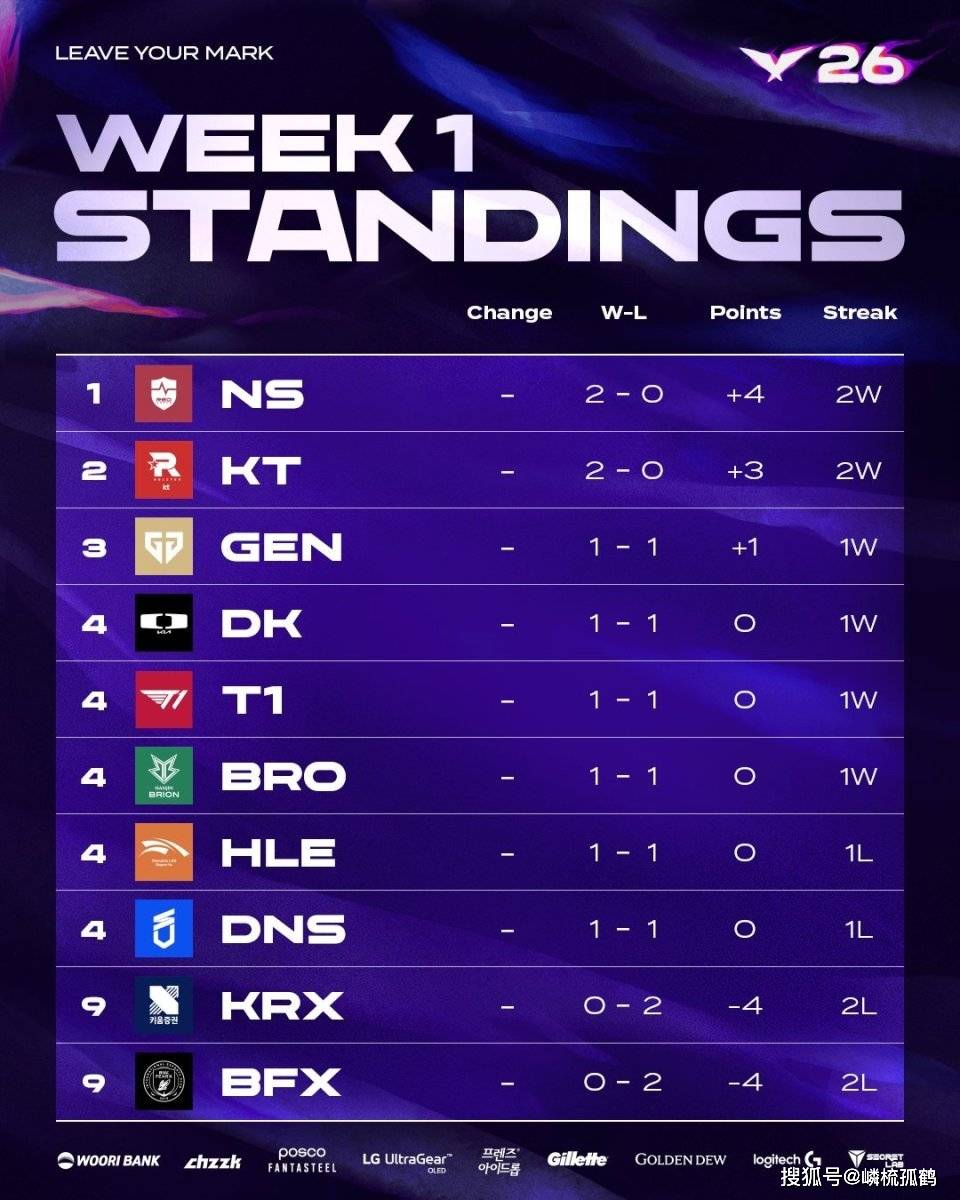 GEN和BFX这场,基本上复刻了LCK杯决赛的桥段,BFX这个队伍是最不像LCK风格的一支队伍,这也就导致他们一旦陷入劣势,根本没什么反转的能力,GEN在此前被KT横扫后,据赛后duro透露,选手们聚在一起进行了一次真诚的对话,起到了很大作用。常规赛第一周的比赛结束后,LCK当下的积分榜是这样的: