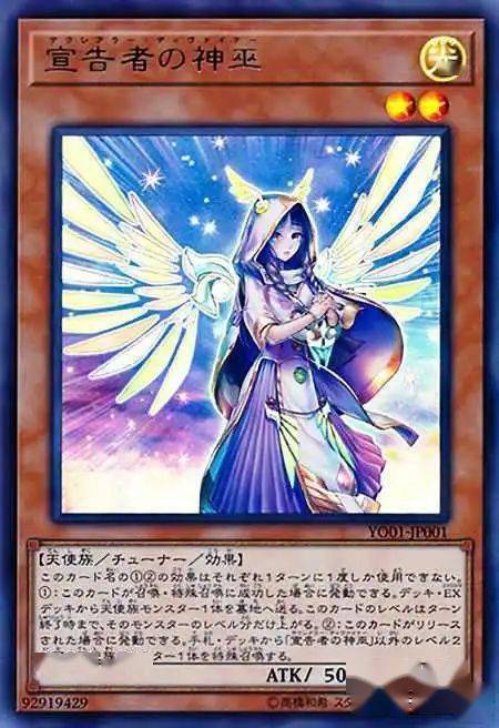 这个卡名的①②的效果1回合各能使用1次。 ①:这张卡召唤·特殊召唤成功的场合才能发动。从卡组·额外卡组把1只天使族怪兽送去墓地。这张卡的等级直到回合结束时上升那只怪兽的等级数值。 ②:这张卡被解放的场合才能发动。从手卡·卡组把「宣告者的神巫」以外的1只2星以下的天使族怪兽特殊召唤。 |
