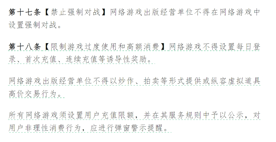 但相比之下,结合《办法》第十七条【禁止强制对战】与第十八条【限制游戏过度使用和高额消费】中的“所有网络游戏须设置用户充值限额,并在其服务规则中予以公示,对用户非理性消费行为,应进行弹窗警示提醒。”