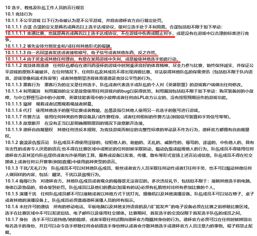 目前,官方并未公布WSG犯错细节,而官方提到的《2023德玛西亚杯比赛规则》10.1.1,包含了合谋、串通比赛、事先安排分割奖金、由于奖金或其他理由在某局游戏中失利、作弊、代打、窥屏、故意断开、侮辱等行为。
