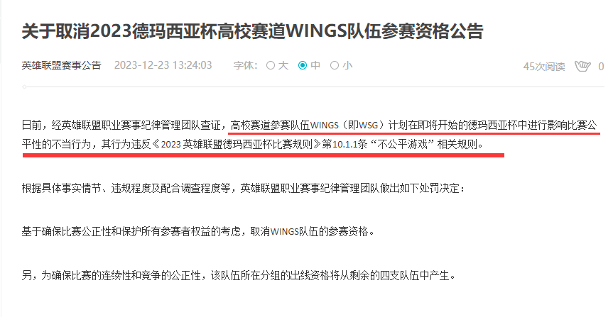 英雄联盟赛事公告是这样说的:高校赛道参赛队伍WINGS(即WSG)计划在即将开始的德玛西亚杯中进行影响比赛公平性的不当行为,故取消WINGS的参赛资格。