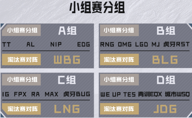 小组赛由于WSG提前淘汰,A组是四支战队TT、AL、NIP和EDG争夺出线资格,参与世界赛的四支战队WBG、BLG、LNG、JDG直接晋级淘汰赛,坐等小组赛出线的队伍挑战自己,争夺半决赛资格。
