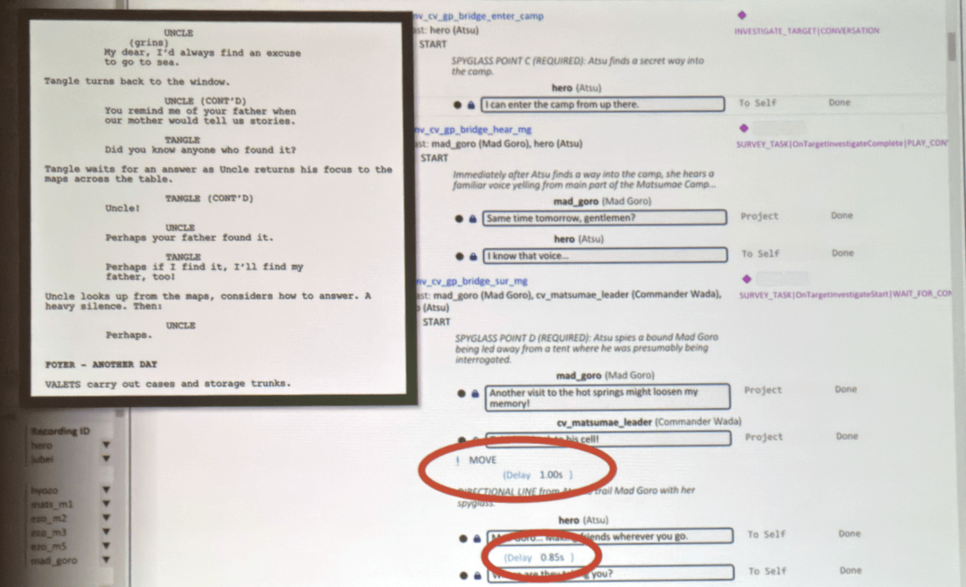 编剧在Google Docs里写剧本。策划会参照这些文档,先在游戏里搭好占位符对话(Placeholder Dialogue);