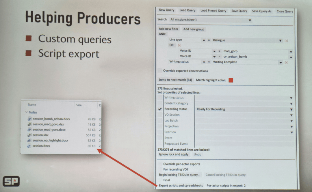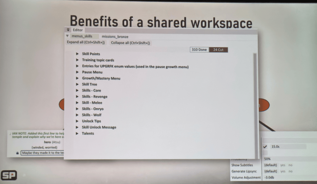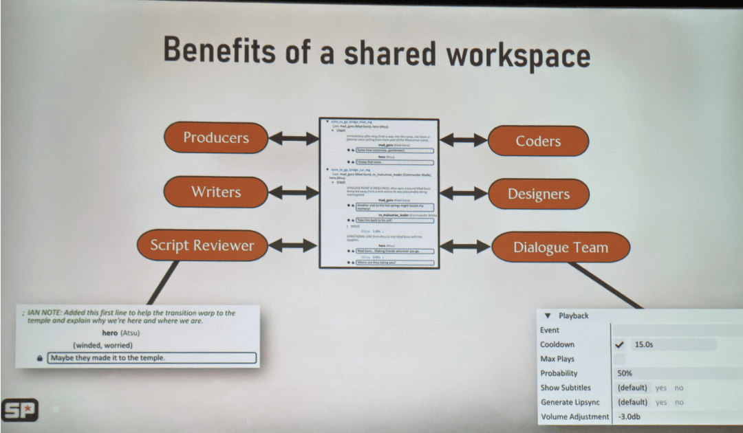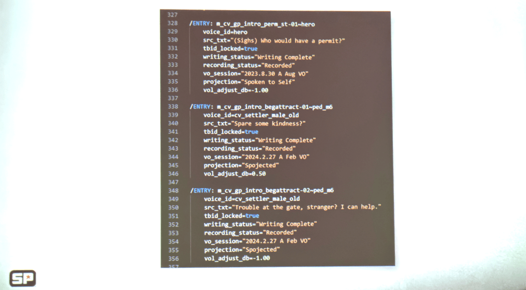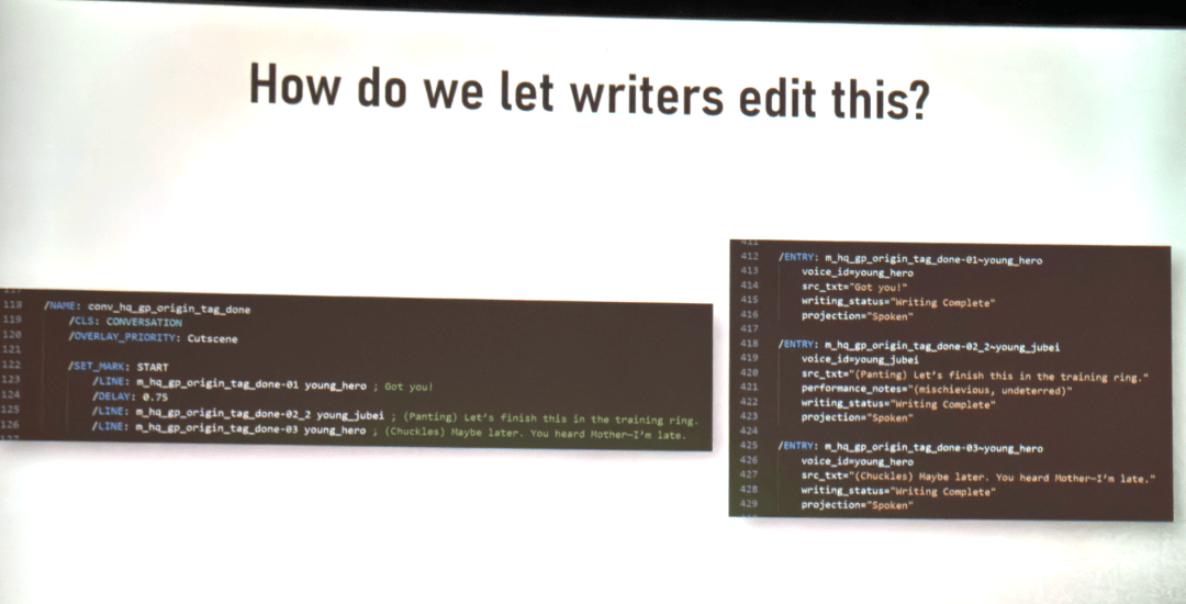 这是新管线里唯一的例外——本地化团队还得用旧的台词数据库。但我们写了脚本,能自动从Perforce把数据同步给他们,至少内部不再有人手动维护台词数据库了。