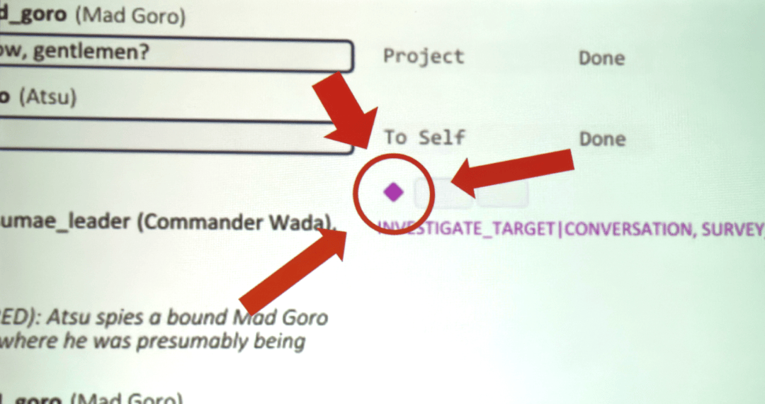 第三,我们在工具里加了一个粉色钻石(Pink Diamond)图标,用来显示“这段对话到底有没有在游戏任务里被触发(Hooked up)”。