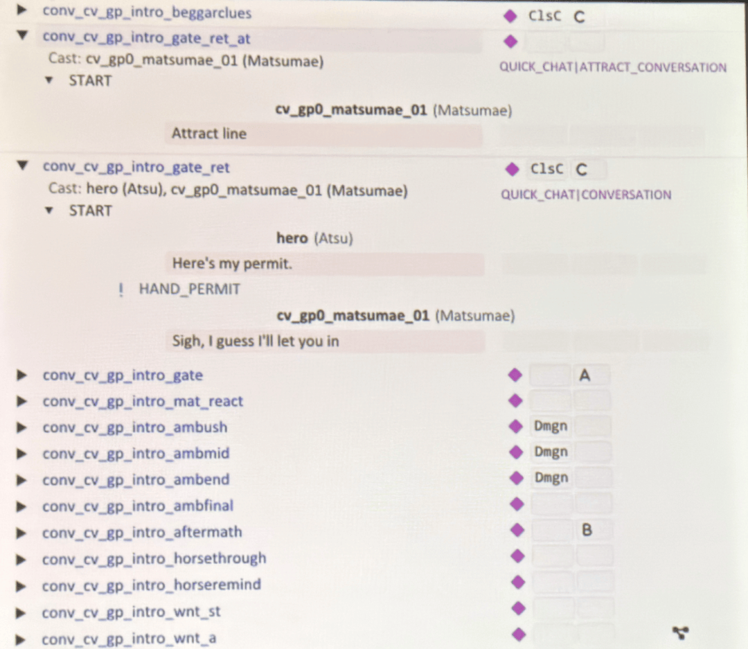 有策划曾告诉我,在做《对马岛之魂》的时候,项目接近尾声时专门做了一次大规模排查,把游戏里所有没被引用的对话全找出来,一个个连上去;而到了《羊蹄山之魂》,这件事从来没发生过。大家在日常工作中看着粉色钻石,边做边就补了。