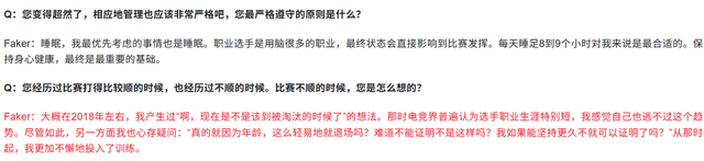 他在采访中直言不讳地表示:“那时电竞界普遍认为选手职业生涯特别短,我感觉自己也逃不过这个趋势。”好在最终Faker克服自我怀疑的心魔,在之后更坚持不懈地投入了训练,希望靠着自己能坚持更久来证明职业选手生涯特别短的观点是错误的。