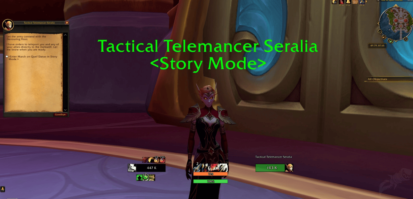 若要进入故事模式,请和NPC战术传送师瑟拉莉亚对话,她位于“进军奎尔丹纳斯”副本入口的左侧。选择相应的对话选项后,就会进入故事模式的队列。