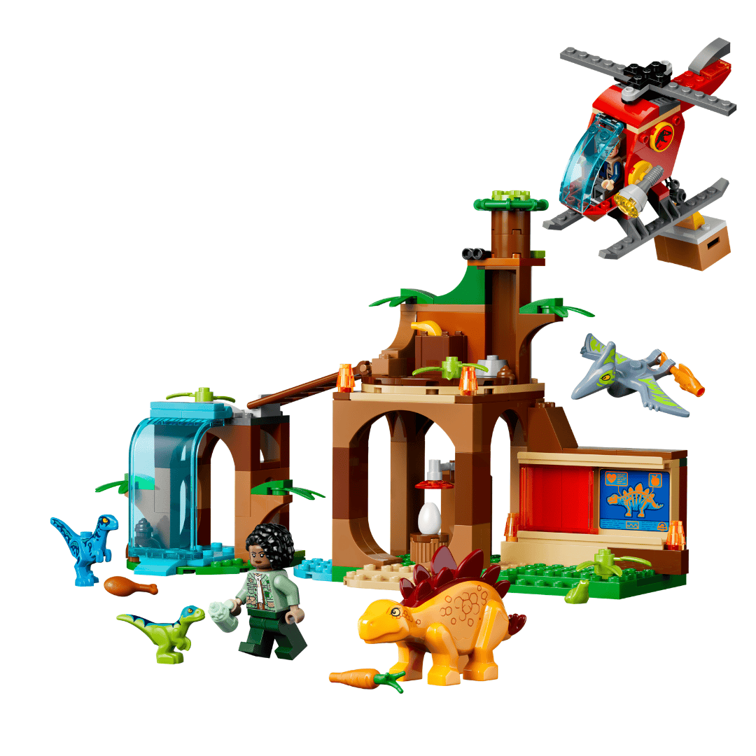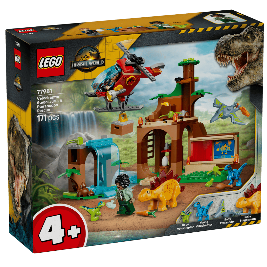 这套“恐龙大礼包”一次给到 4 只恐龙:幼年迅猛龙、青年迅猛龙、幼年翼龙、幼年剑龙。搭配直升机、救援场景和 2 个人仔,玩法密度很高。